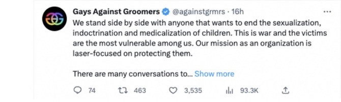 It’s from a group I admire hugely called Gays Against Groomers and the extent of its alleged hate speech are expressions like this which say,